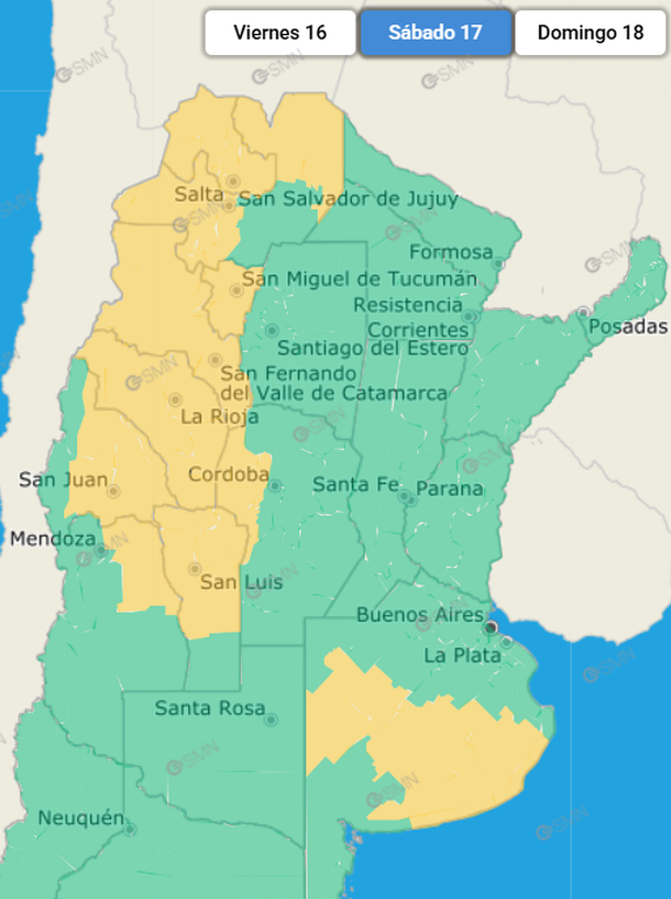 Los territorios del país que estarán afectados por la alerta amarilla de este martes son Salta, Jujuy, Tucumán, Catamarca, La Rioja, Córdoba, San Luis, San Juan, Mendoza y Buenos Aires.