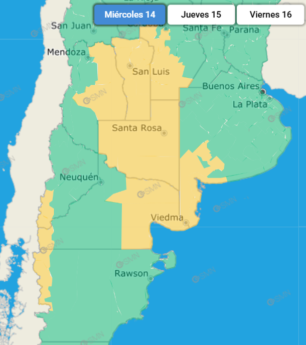 Además, hay alerta amarilla por lluvias para la zona cordillerana de Neuquén, Río Negro y Chubut.