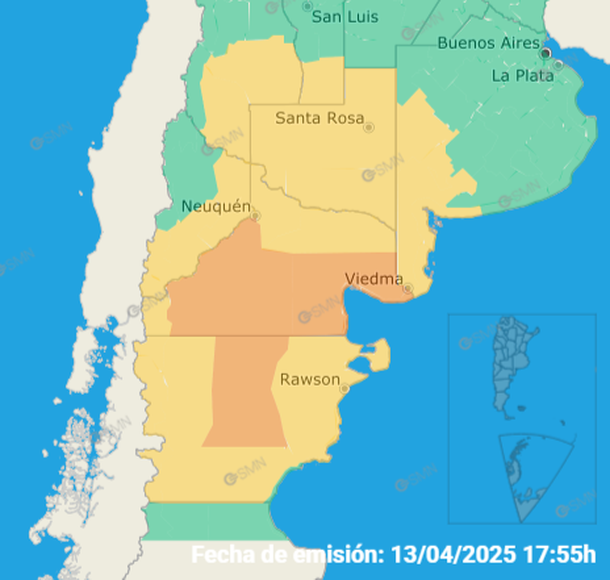 Las provincias bajo alerta por lluvias y tormentas fuertes, con posible caída de granizo son Buenos Aires, Chubut, Neuquén, Río Negro, La Pampa, San Luis y Mendoza.