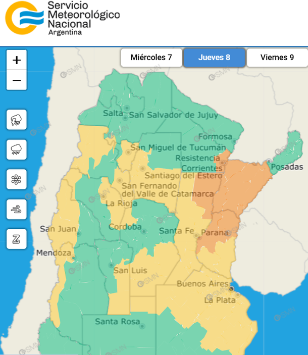Para este jueves hay alerta amarilla por lluvias fuertes, con posible caída de granizo, en la Capital Federal, y las provincias de Buenos Aires, La Pampa, San Luis, Córdoba, Santa Fe, Entre Ríos, Chaco, Formosa, Corrientes, Catamarca, Tucumán y La Rioja.