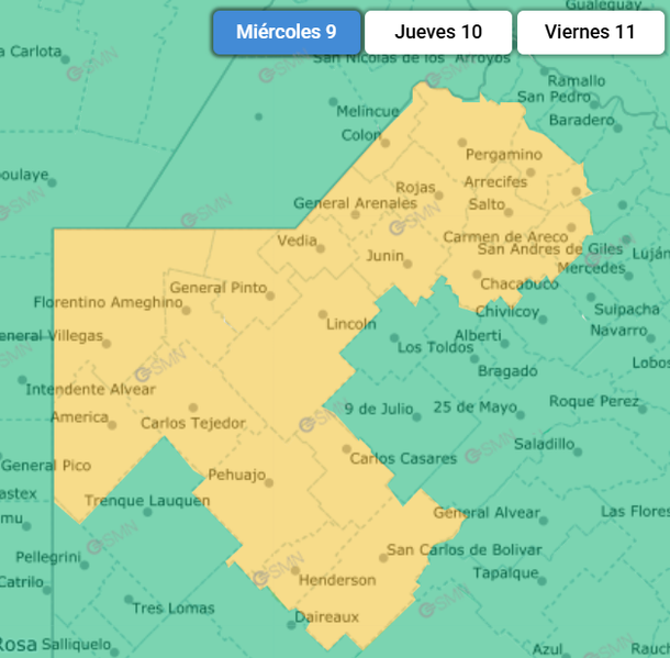 La zona noroeste de la provincia de Buenos Aires está bajo alerta amarilla este miércoles feriado, en una alerta que se extenderá durante gran parte de la jornada.