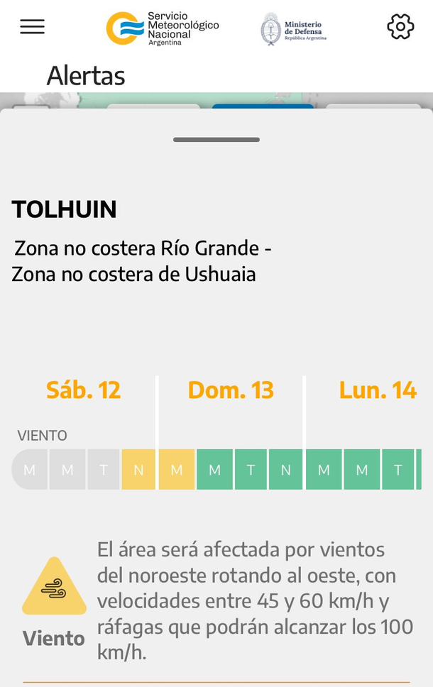 "El área será afectada por vientos del noroeste rotando al oeste, con velocidades entre 45 y 60 km/h y ráfagas que podrían alcanzar los 100 km/h", anticipó el SMN.