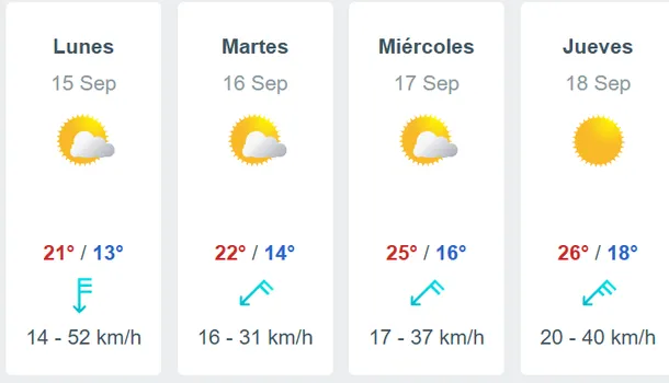 El área será afectada por vientos del sector oeste con velocidades entre 50 y 70 km/h, con ráfagas que pueden superar los 100 km/h, especialmente en los niveles más altos.