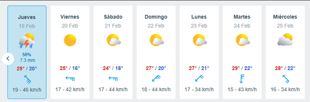 Jueves 19: Último día de la saga, con tormentas, 50% de probabilidad y 7.3 mm de agua.