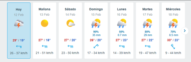 El inicio del mal clima será abrupto y severo. Para el domingo 15, el Servicio Meteorológico prevé un 90% de probabilidad de tormentas. Se espera que sea el día con mayor caída de agua, con un acumulado estimado de 35 mm y un descenso de la temperatura a 26°.