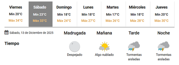 Según el pronóstico del SMN, este sábado 13 de diciembre llegarán tormentas aisladas a la Ciudad, en tanto que el termómetro oscilará entre los 23 y 33 grados, lo que significará un nuevo sofocante día para porteños y bonaerenses. Pero las precipitaciones, que tendrán lugar desde la tarde, traerán el alivio que se sentirá recién el domingo.