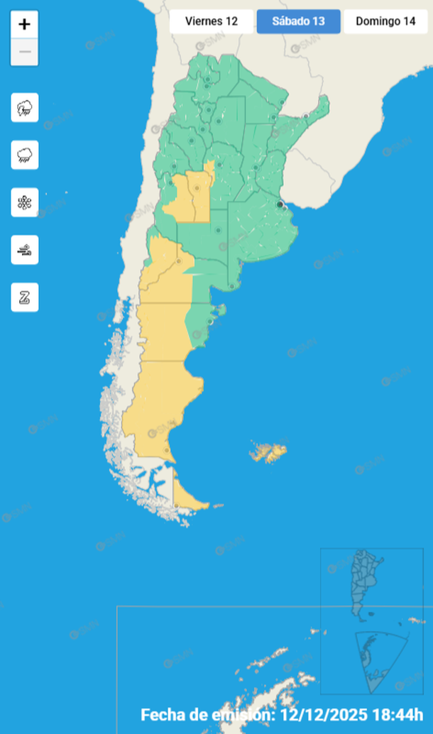 En tanto, Neuquén, Chubut, Río Negro, Santa Cruz y Tierra del Fuego enfrentan una alerta amarilla por fuertes vientos.