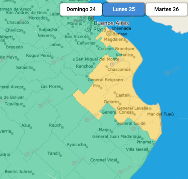 Este lunes estará complicado en algunas ciudades de la provincia de Buenos Aires, entre las que se encuentran algunas zonas del AMBA, según informó en las últimas horas el Servicio Meteorológico Nacional (SMN).
