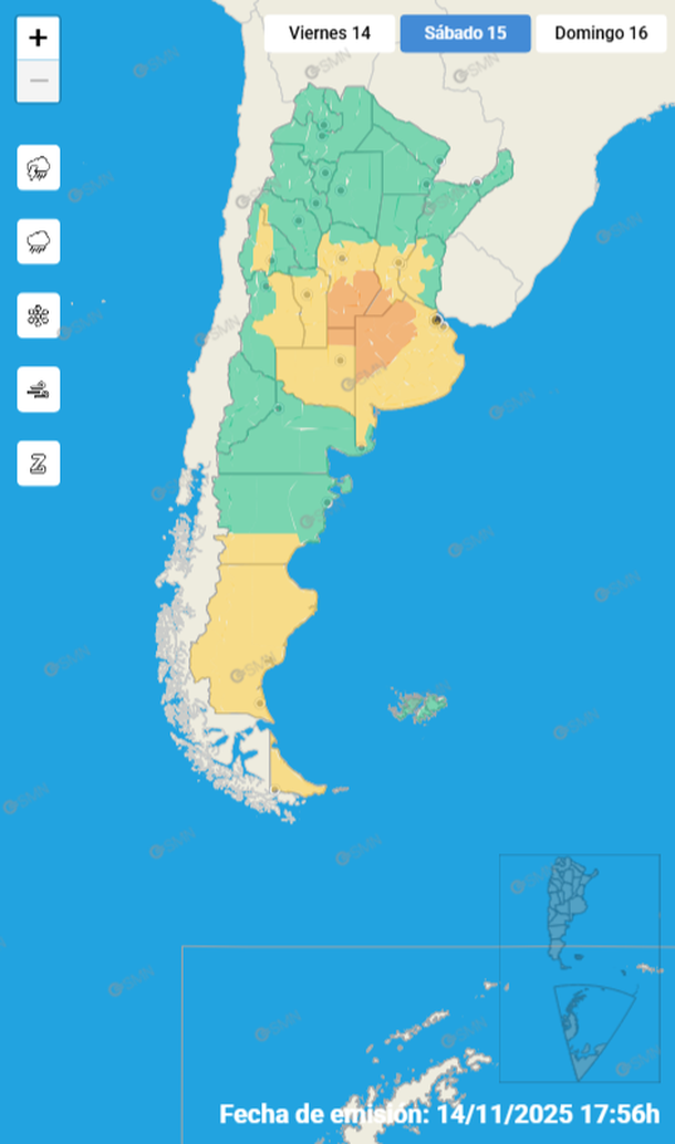 El Servicio Meteorológico Nacional (SMN) ha emitido alertas amarilla y naranja por tormentas, afectando a varias regiones del país. Este sábado 15 de noviembre se espera un clima adverso, el cual anticipa que el mal tiempo se extenderá también al Área Metropolitana de Buenos Aires (AMBA) y a otras partes del país.
