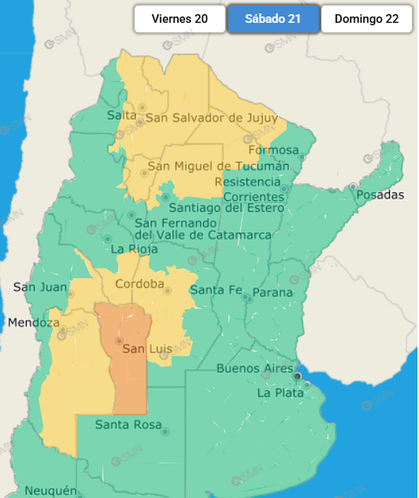 Los territorios del país que estarán afectados por la alerta amarilla de este viernes son Salta, Jujuy, Tucumán, Formosa, Chaco, Santiago del Estero, Tucumán, Córdoba, La Rioja, San Juan y Mendoza.