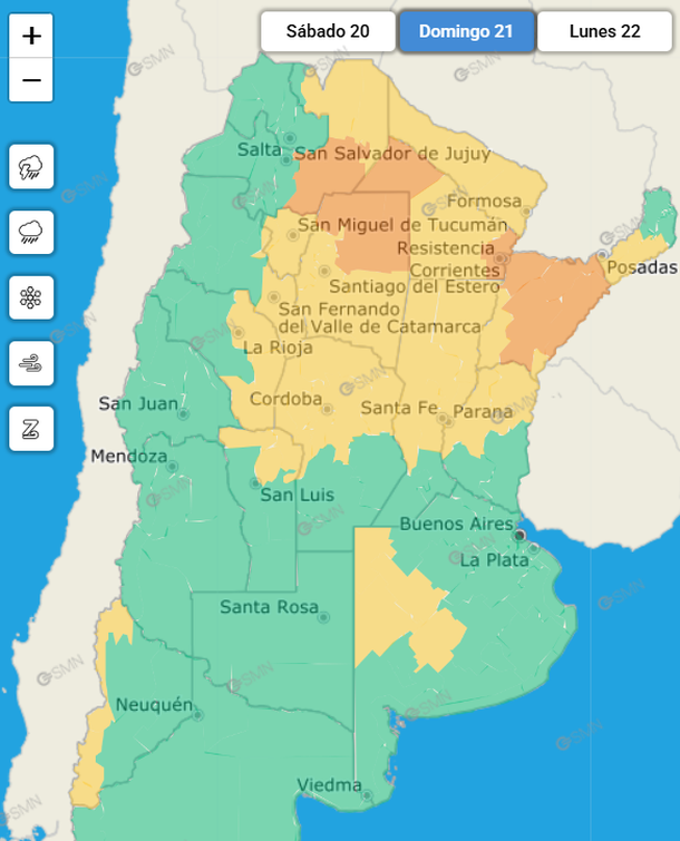 La primera advertencia del organismo nacional abarca a las provincias de Salta, Santiago del Estero, Chaco, una pequeña parte de Santa Fe y casi la totalidad de Corrientes.