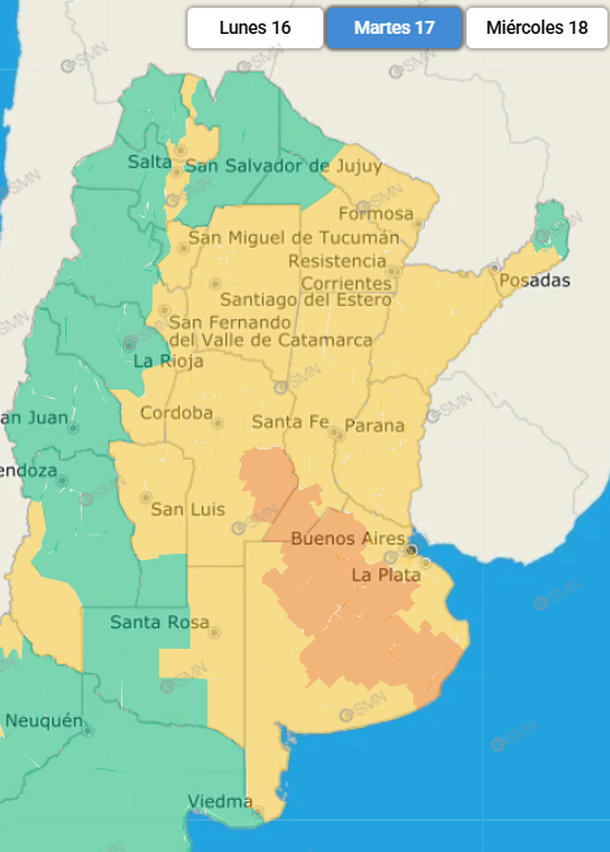 Los territorios del país que estarán afectados por la alerta amarilla de este martes son Salta, Jujuy, Formosa, Chaco, Misiones, Corrientes, Santa Fe, Córdoba, Santiago del Estero, Tucumán, Catamarca, La Rioja, Entre Ríos, Buenos Aires, San Luis y La Pampa.