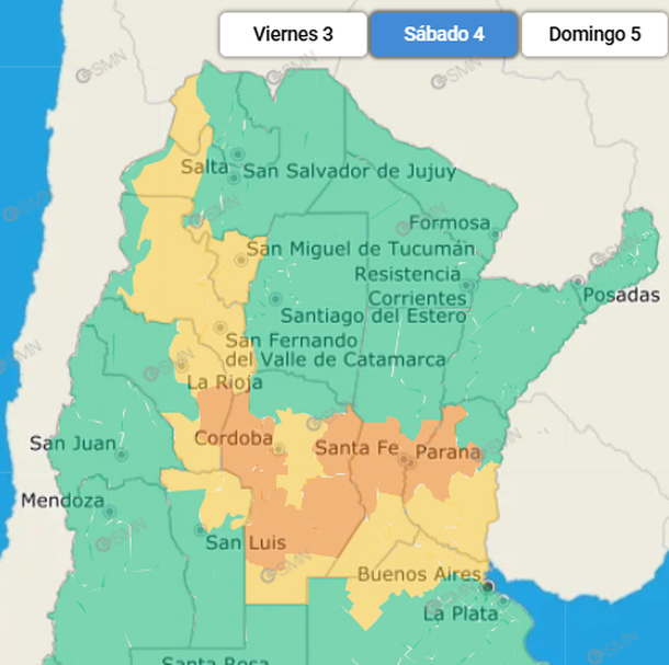Los territorios del país que estarán afectados por la alerta amarilla de este sábado son Salta, Jujuy, Tucumán, Catamarca, La Rioja, San Luis, Córdoba, Santa Fe, Entre Ríos y Buenos Aires.