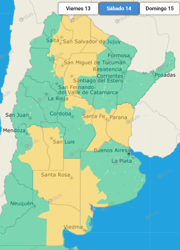 Los territorios del país que estarán afectados por la alerta amarilla de este martes son Buenos Aires, Salta, Jujuy, Tucumán, Santiago del Estero, Córdoba, Santa Fe, Entre Ríos, San Luis, Mendoza, La Pampa y Río Negro.