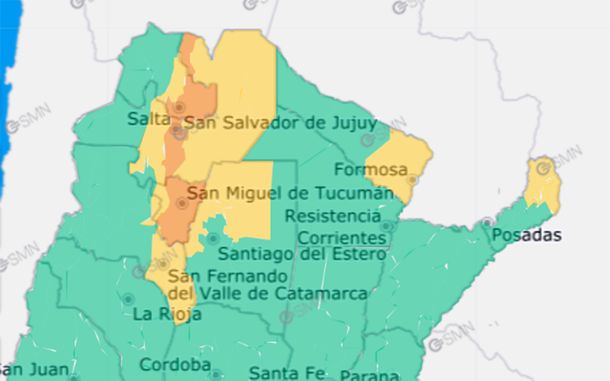 Misma situación se prevé para la mayor parte de Salta, que está bajo alerta amarillo con excepción de la franja central del territorio provincial, incluida su capital, que tiene alerta naranja.