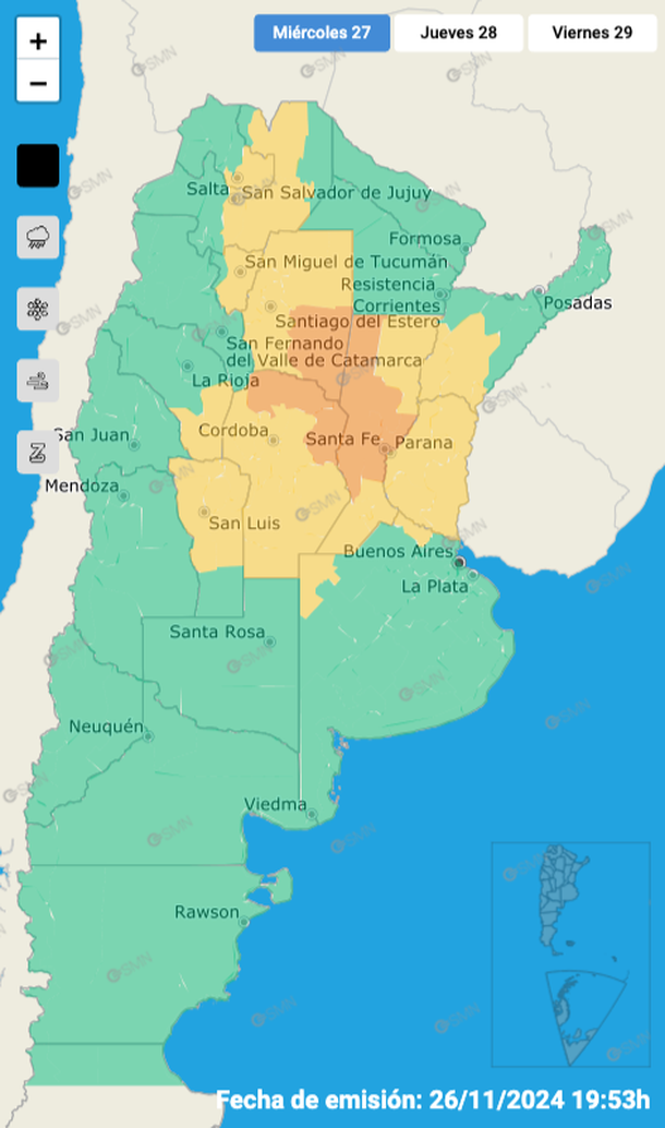 Como ocurre desde el fin de semana, se trata de un aviso amarillo que este miércoles 27 de noviembre alcanzaba a zonas de las provincias de Buenos Aires, Entre Ríos, Corrientes, Santa Fe, Córdoba, Santiago del Estero, San Luis, La Rioja, Tucumán, Salta y Jujuy.