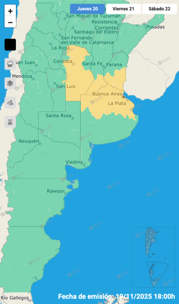 De esta manera, sigue este jueves 20 de noviembre un aviso de nivel amarillo por tormentas fuertes para zonas de Buenos Aires y las provincias de Entre Ríos, Santa Fe y Córdoba.
