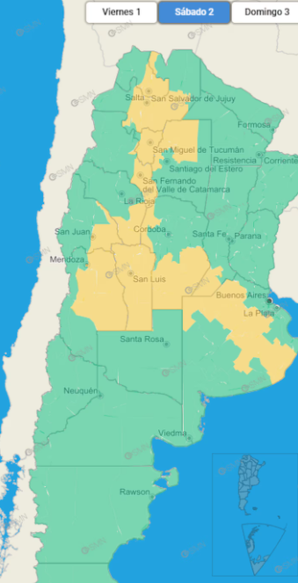 En tanto las provincias de Mendoza, San Luis, San Juan y el sur de La Rioja tienen alerta amarilla por vientos fuertes del sudoeste o sur con velocidades entre 35 y 50 km/h, y ráfagas que pueden alcanzar los 70 km/h.