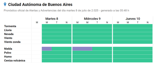 Por este motivo, el Servicio Meteorológico Nacional (SMN) emitió alertas violetas para la mañana de este martes y lo mismo para el miércoles 9 de julio de 2025 en toda la zona del AMBA.