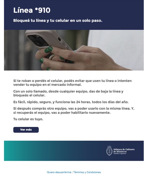 “Si te roban o perdés el celular, podés evitar que usen tu línea o intenten vender tu equipo en el mercado informal. Con un solo llamado, desde cualquier equipo, das de baja la línea y bloqueás el celular”, indica el mail, lo cual realmente ocurre al comunicarse con la línea *910.