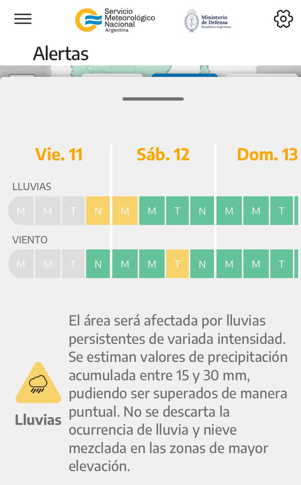 En este sentido, el SMN anticipó que, durante la mañana de este sábado 12 de julio, las áreas mencionadas "serán afectada por lluvias persistentes de variada intensidad. Se estiman valores de precipitación acumulada entre 15 y 30 mm, pudiendo ser superados de manera puntual. No se descarta la ocurrencia de lluvia y nieve mezclada en las zonas de mayor elevación".
