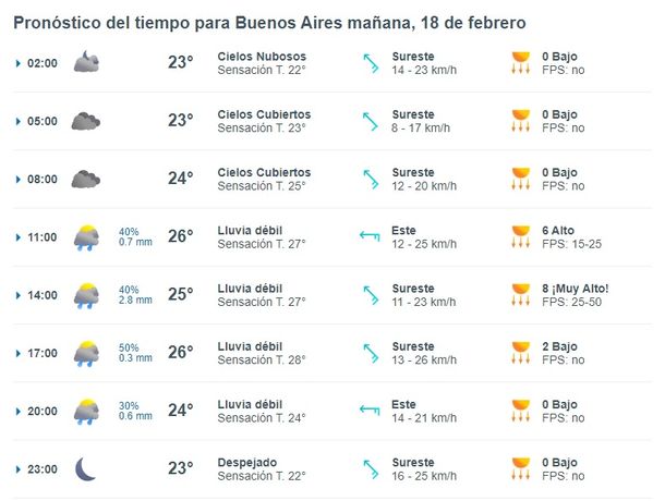 Por su parte, el sitio Meteored precisa que este domingo 18 de febrero caerán lluvias débiles a las 14, a las 17 y a las 20 en la Ciudad de Buenos Aires y alrededores.
