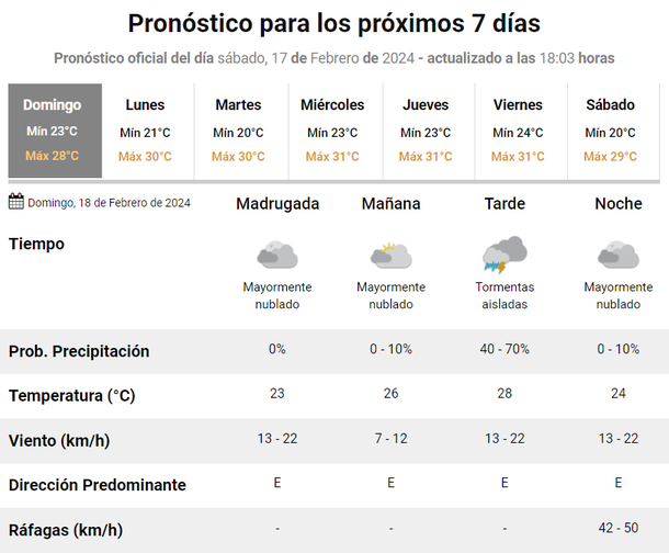 De esta manera, el SMN anuncia para el domingo 18 de febrero vientos leves a moderados del este, una temperatura que oscilará entre los 22 y los 28 grados y lluvias aisladas durante la tarde en el Área Metropolitana de Buenos Aires (AMBA).