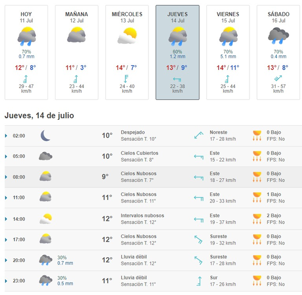 El jueves se presenta con cielo nublado por la mañana, una máxima de 13 grados, una mínima de 9 y probabilidades de lluvia débil por la noche.