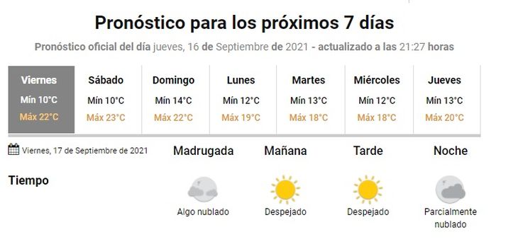 Para el sábado, en tanto, se anticipa cielo algo nublado y marcas térmicas que oscilarán entre 10 y 23 grados; mientras que el domingo habrá cielo mayormente nublado y temperaturas que irán de 14 a 22 grados.