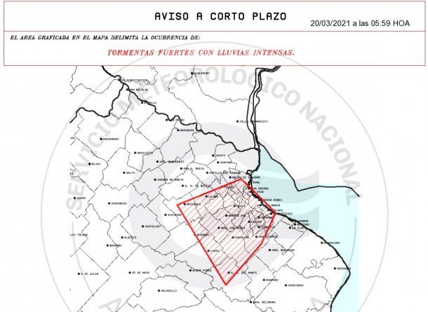 La advertencia del SMN es por lluvias intensas y rige para CABA, Río de la Plata interior y los partidos bonaerenses de Almirante Brown - Avellaneda - Berazategui - Cañuelas - Escobar - Esteban Echeverria - Ezeiza - Florencio Varela - Gral. Belgrano - Gral. Las Heras - Gral. Rodríguez - Gral. San Martin - Hurlingham - Ituzaingo - José C. Paz - La Matanza - Lanús - Lobos - Lomas de Zamora - Lujan - Malvinas Argentina - Marcos Paz - Mercedes - Merlo - Moreno - Morón - Navarro - Pilar - Pte. Perón - Quilmes - S. M. del Monte - San Fernando - San Isidro - San Miguel - San Vicente - Tigre - Tres de Febrero - Vicente López.