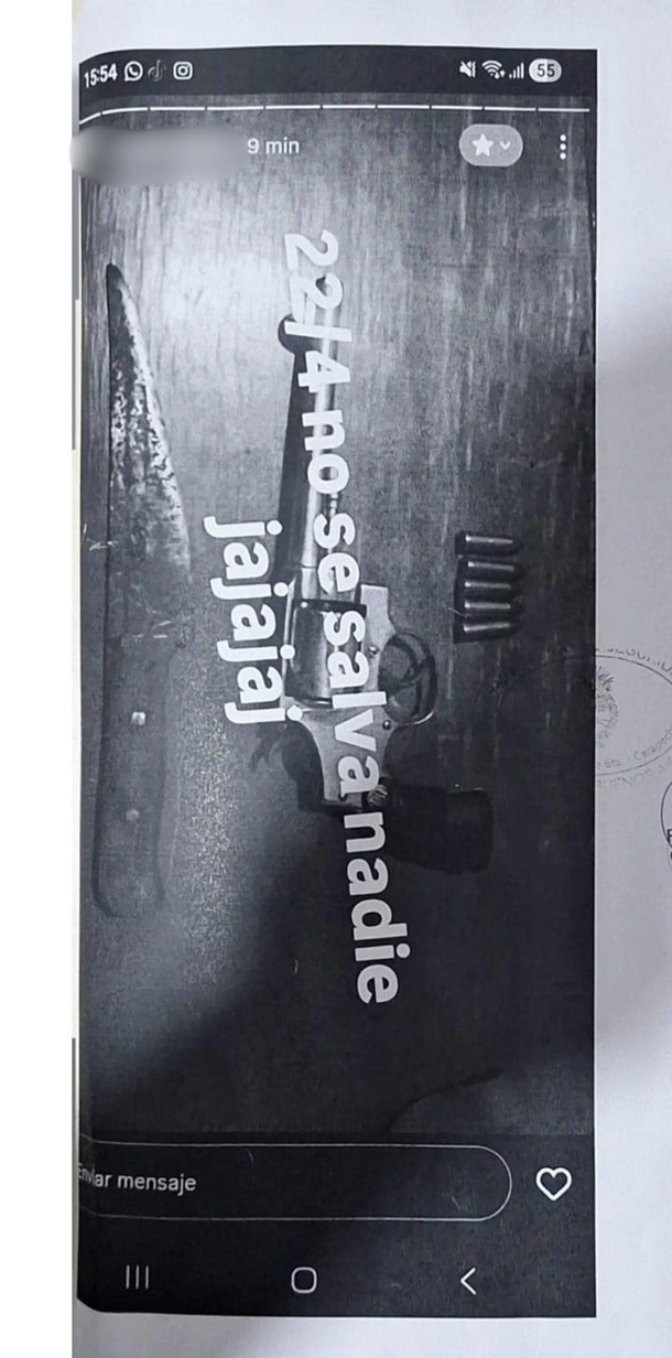 De acuerdo con la información obtenida por la señal TN, la causa se inició a partir de la denuncia de un docente del colegio. La alarma se encendió cuando el estudiante publicó una historia en su cuenta de Instagram, donde se veía la imagen de una pistola acompañada de un mensaje intimidante: “El 22/04 no se salva nadie jajajaj”.