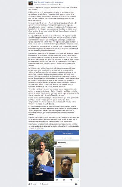 Marcelo Sergio Villalba, el mismo que estoy querellando por abuso sexual por esta agresión que les relato, está ahora comprometido, tres meses después, por pruebas que lo vinculan con la violación y homicidio de Anahí Benítez”, sostiene en el final de su escalofriante relato.