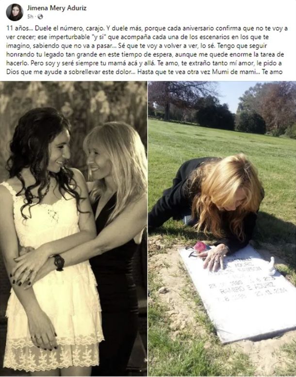 En una de las imágenes se la ve a Aduriz junto con su hija en su fiesta de 15 y en la otra arrodillada sobre la tumba de la adolescente en el cementerio Jardín de Paz.