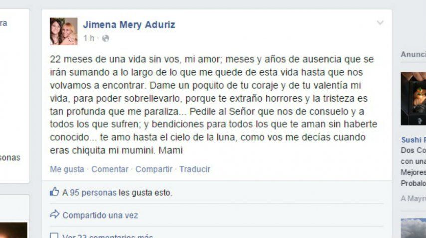 "Pedile al Señor que nos de consuelo y a todos los que sufren; y bendiciones para todos los que te aman sin haberte conocido.te amo hasta el cielo de la luna, como vos me decías cuando eras chiquita mi mumini. Mami", finaliza el escrito.