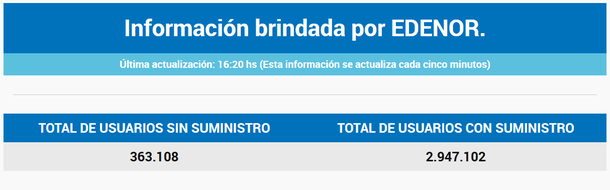 De acuerdo a la información brindada por Edenor, cerca de las 17 horas aún hay 363.108 hogares sin luz y se espera que el servicio se normalice a la brevedad.