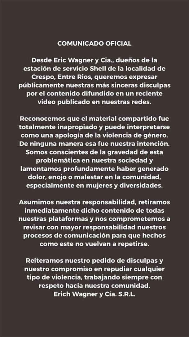 Previamente, la propia estación de servicio había pedido disculpas públicas por el repudiado video: “Desde Eric Wagner y Cía., dueños de la estación de servicio Shell de la localidad de Crespo, Entre Ríos, queremos expresar públicamente nuestras más sinceras disculpas por el contenido difundido en un reciente video publicado en nuestras redes”.