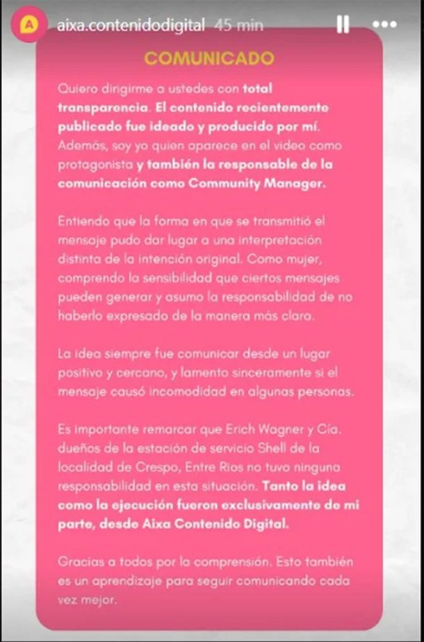 También enfatizó que la empresa que administra la estación de servicio no tuvo ninguna responsabilidad en lo sucedido. “Es importante remarcar que Erich Wagner y Cia., dueños de la estación de servicio Shell de la localidad de Crespo, Entre Ríos, no tuvo ninguna responsabilidad en esta situación. Tanto la idea como la ejecución fueron exclusivamente de mi parte, desde Aixa Contenido Digital”.