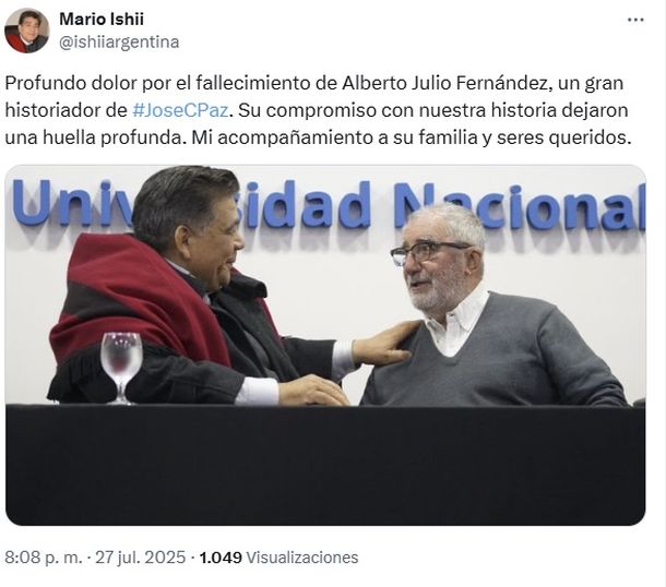 “El Intendente Municipal de José C. Paz, Dr. HC Mario Alberto Ishii, con profundo dolor, comunica su fallecimiento y, en nombre de toda la administración municipal, envía las respetuosas condolencias a sus familiares y amigos. Cabe agregar que, Alberto Julio Fernández, con gran vocación de servicio y compromiso con el desarrollo de nuestra comunidad, durante varios años, se desempeñó como director del Museo Histórico “José Altube” del distrito”, indicaron las autoridades del municipio.