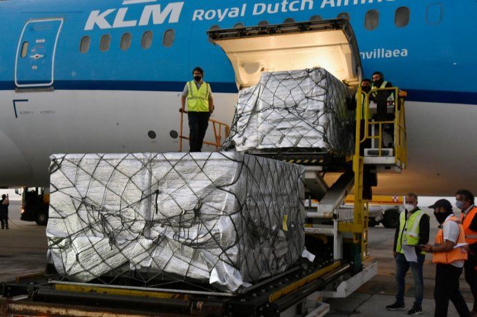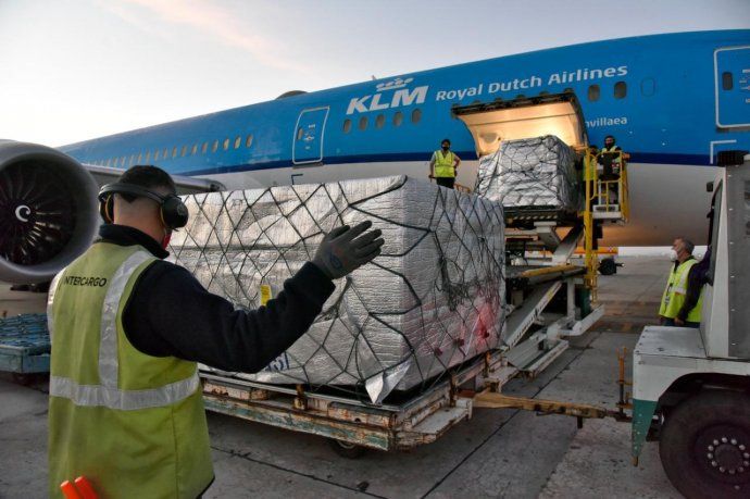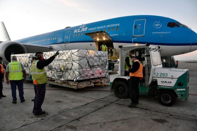 Las 864 mil vacunas arribaron a las 6.22 al aeropuerto internacional de Ezeiza en el vuelo regular de pasajeros KL701, de la compañía de los Países Bajos, KLM, proveniente de Ámsterdam.