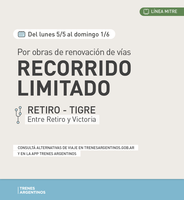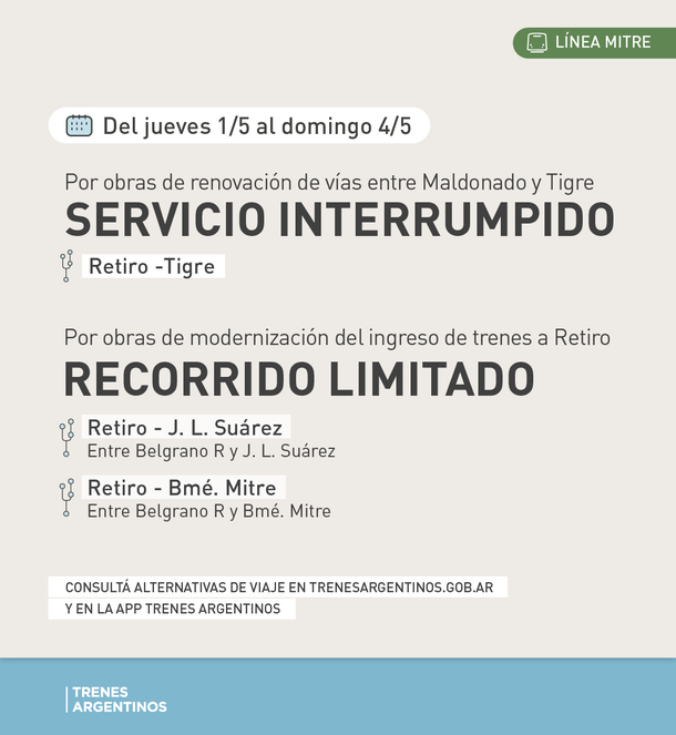 "Por el avance de la obra de renovación de vías, del jueves 1/5 al domingo 4/5 los trenes no saldrán ni llegarán a Retiro", informó la empresa estatal Trenes Argentinos.