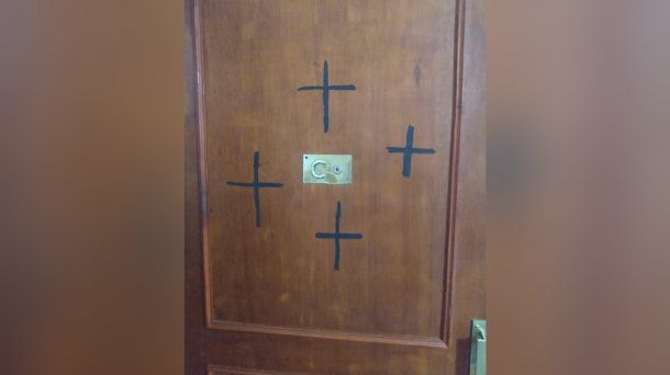 "Psicológicamente esto te destruye. Hace dos meses fueron las cuatro cruces en la puerta y un cartel anónimo diciéndome que me vaya. Esta mañana, la chica de limpieza y luego mi hijo, se encontraron con una imagen muy desagradable en la alfombra de la puerta. Era huevo y un cruz pintada con un rojo sangre y una cruz con sal", dijo la mujer a La Brújula 24.