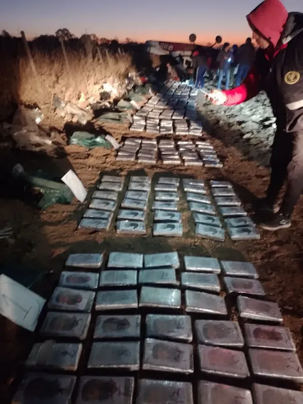 Sin embargo, al llegar, los efectivos descubrieron que no se hallaban personas heridas ni fallecidas y encontraron la aeronave volcada, con la carga de 10 panes rectangulares de color verde con un logo identificatorio de una mano abierta y un rostro con barba, que en su interior contenían un total de 324,500 kilos de cocaína, los cuales quedaron a disposición de la justicia federal.