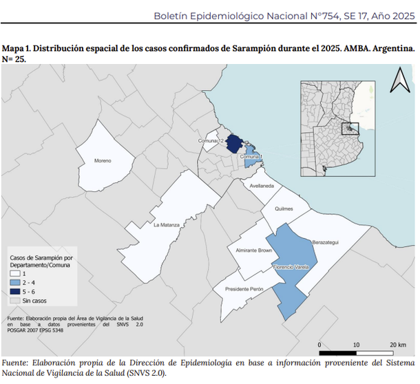 Las localidades que se vieron afectadas por este brote de sarampión son Adrogué, Avellaneda, Berazategui, Florencio Varela, Guernica, La Matanza, Moreno y Quilmes