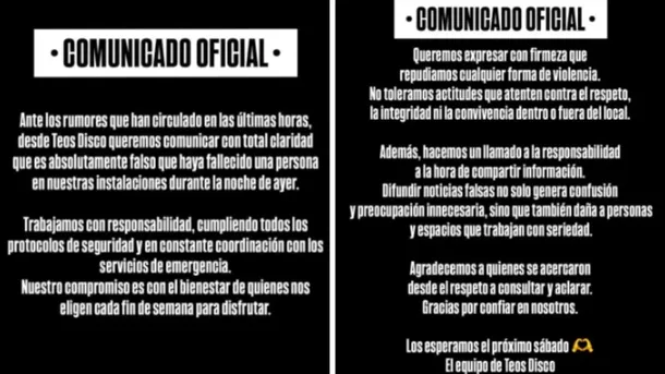 Con motivo dela viralización de rumores respecto al presunto fallecimiento de una persona en el lugar, desde Teos Disco difundieron un comunicado oficial a través de sus redes sociales para aclarar la situación.