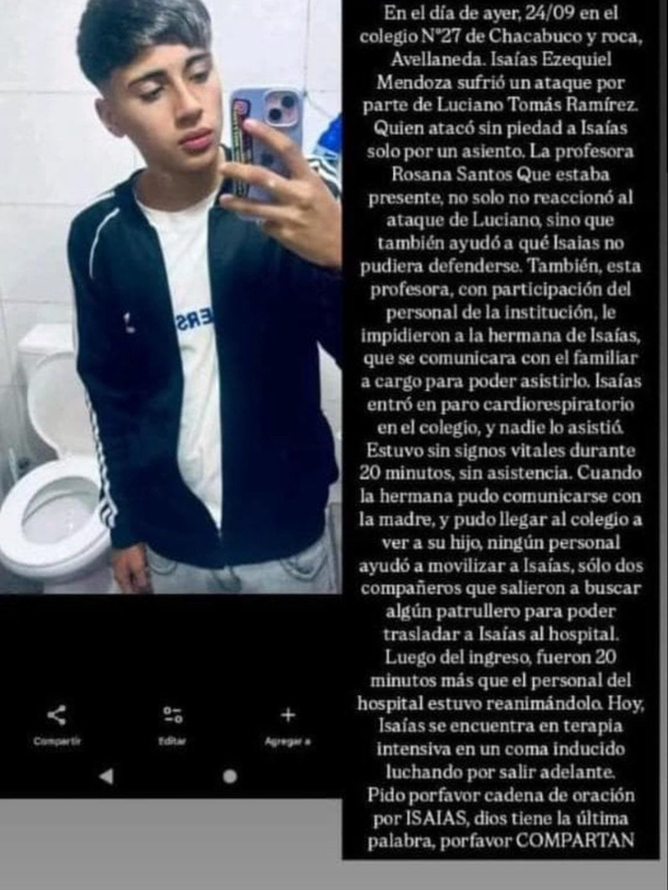 Según el relato difundido por la familia en redes sociales, la agresión fue feroz y no provocada más allá de la discusión inicial: “Sufrió un ataque por parte de L.R., quien atacó sin piedad a Isaías solo por un asiento”, denunció la hermana del joven.