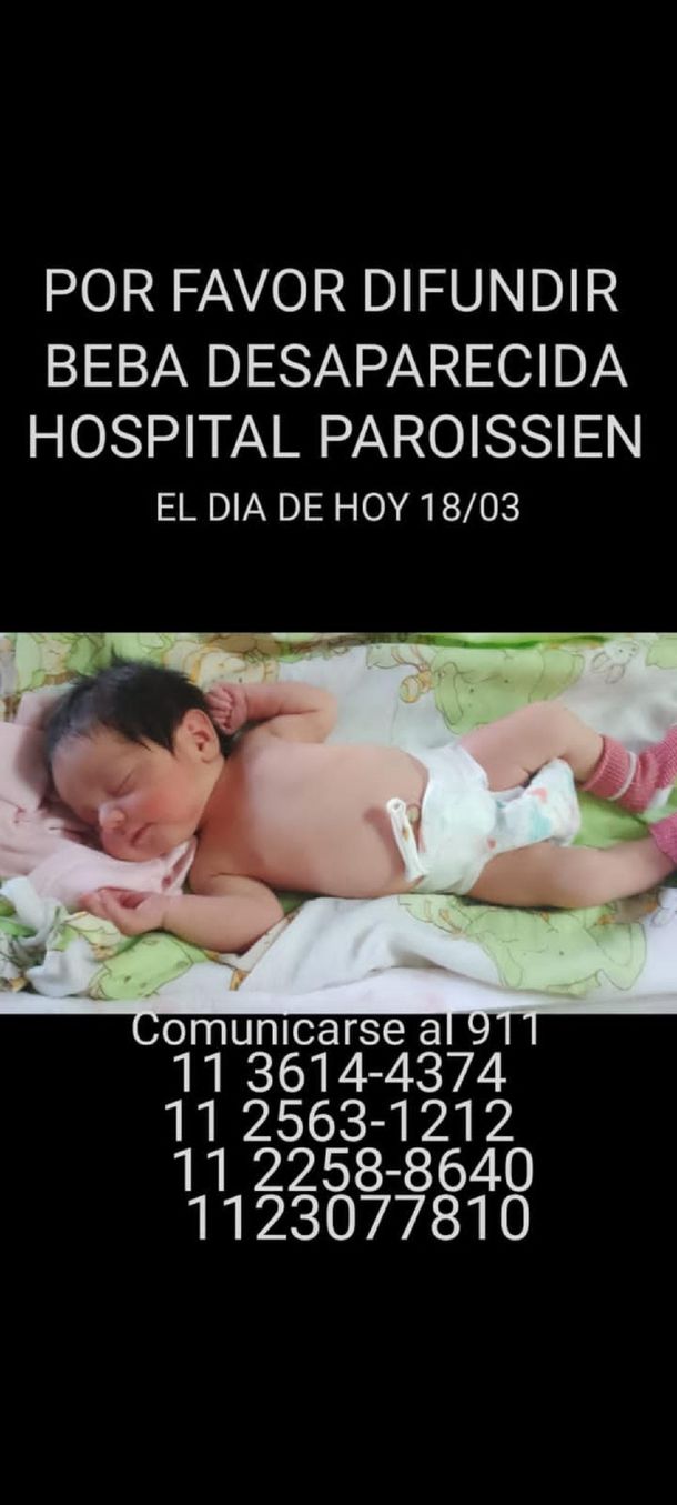 Sus familiares piden ayuda para dar una beba que fue robada en el hospital Paroissien de Isidro Casanova.