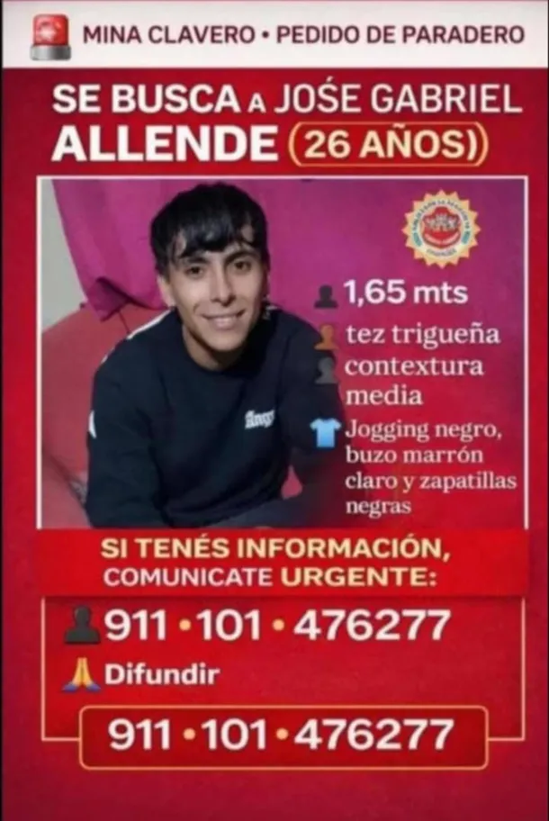 José Gabriel Allende, de 26 años, es intensamente buscado por las autoridades de las localidades cordobesas de Mina Clavero y Villa Cura Brochero, luego de que desapareciera hace casi una semana cuando salió de su casa para reunirse con amigos. La familia realizó la denuncia y dio detalles de algunos lugares y personas con los que habría estado el joven antes de que le perdieran el rastro.