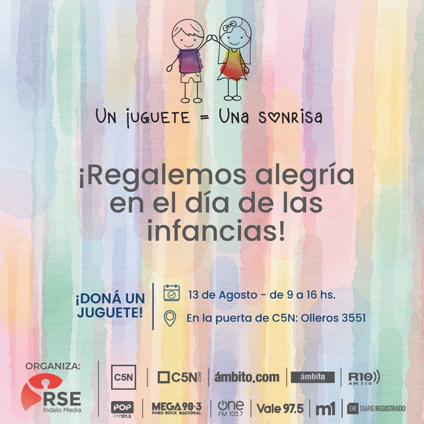 El sábado 13 de agosto de 9:00 a 16:00 horas en el día de las Infancias, estamos haciendo en la puerta de C5N una cruzada solidaria para juntar juguetes.