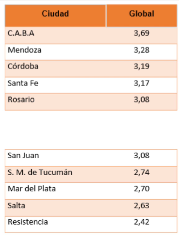 En el primer Índice de Gestión Estratégica de Ciudades (IGEC) elaborado por la Facultad de Ciencias Económicas de la UBA, la Ciudad Autónoma de Buenos Aires se ubicó en el primer puesto, seguida por Mendoza, Córdoba, Santa Fe, Rosario y San Juan (3,08). Completan la lista San Miguel de Tucumán, Mar del Plata, Salta y Resistencia.