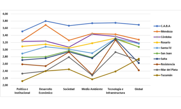 Si bien en las cinco dimensiones estudiadas CABA mantiene el primer lugar, varían las posiciones de las otras ciudades, según la dimensión. Es así que, en la dimensión Política e Institucional, se destacan Mendoza, Córdoba y Rosario; en Desarrollo Económico, Santa Fe, Córdoba y Rosario; en Sociedad, Mendoza, Santa Fe y San Juan; en Medio Ambiente, San Juan, Mendoza y Córdoba; en Tecnología e Infraestructura, Santa Fe, Mendoza y Rosario.